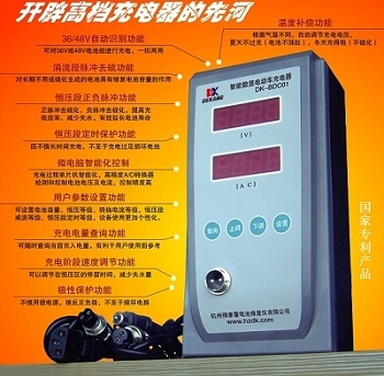 3)我是前几天买的一个得康DK-BDC01智能数显电动车充电器, 不过刚拿到的时候浮充电压过高[我这里是广东,室温27C,浮充电压先从55.67V开始慢慢升高到56.25V,这时充电器外壳明显发热(感觉好象是充电器内温度升高电压也跟着上升)];之后我就联系上得康的技术工作人员,介绍到充电器内有一个可调节器。我把浮充电压调到54.76V,但问题就来.